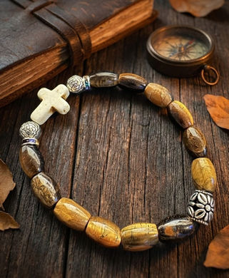 Discover the timeless elegance of our Tigers Eye with White Stone Cross Bracelet at SoulStrand Co. This exquisite piece combines the grounding energy of Tiger's Eye with the purity and faith represented by the white stone cross, creating a striking symbol of belief and strength. Each bracelet is meticulously crafted to serve as a stylish reminder of your faith, allowing you to embody your spiritual beliefs with pride. Perfect for any occasion, this bracelet aligns seamlessly with our commitment to offering beautifully crafted jewellery that resonates with your soul. Let this piece from SoulStrand Co. be a cherished addition to your collection, a testament to both fashion and faith.